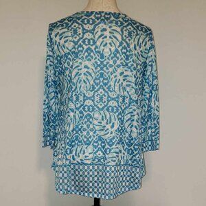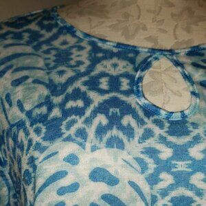 This gorgeous top is from Ruby Rd. Blue/teals/white. Keyhole neck. Curved hem. Boat Neck. Loose fit. Size Medium