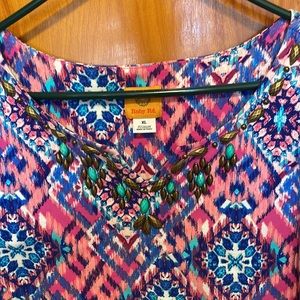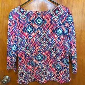 Ruby Rd 3/4 sleeve top. Stretchy material. Multi colored print with beaded neckline—slight v neck cut out