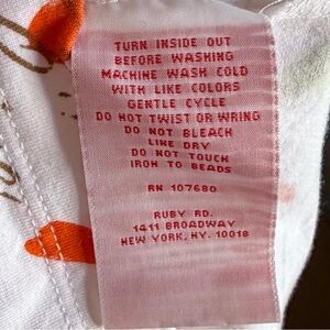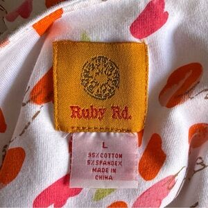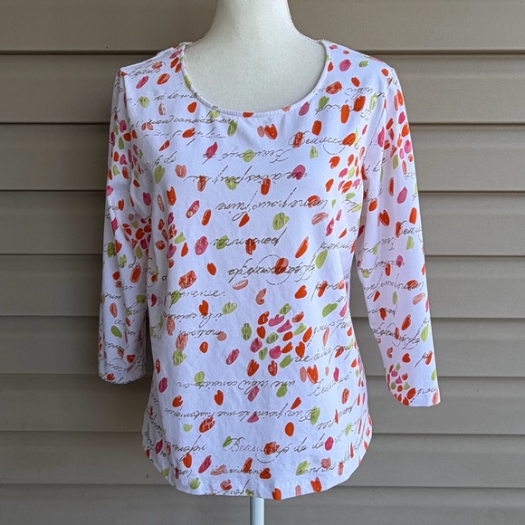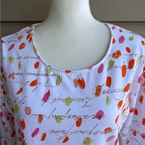 This is a fun and eye-catching Ruby Rd. top, ladies size Large. The soft knit fabric, 95% cotton/5% spandex, features a colorful abstract print in shades of orange and green, with subtle clear sequin embellishments that add a touch of sparkle without being overpowering. Set on a crisp white background with script accents, this top is perfect for adding a little shine to your everyday look!