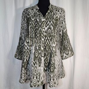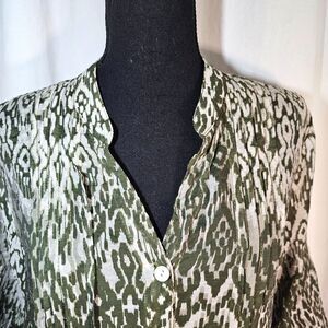 Ruby Rd. Airy Gauzy Unique Button Up Top Blouse in Olive Green & White sz M