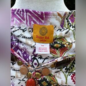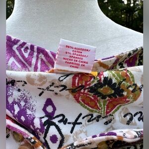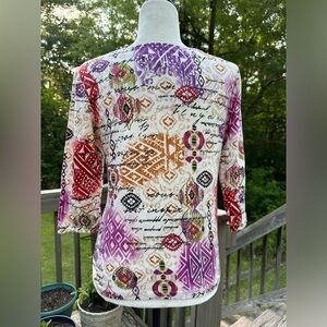 Excellent used condition. Free of any signs of wear. Comes from a smoke and pet free home. Size MP. V-Neck outlined with beading. Material does have some stretch to it. 95% cotton, 5% spandex. Machine Wash inside out. Depending on how long your arms are this is 3/4 sleeve.