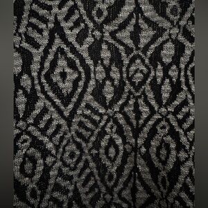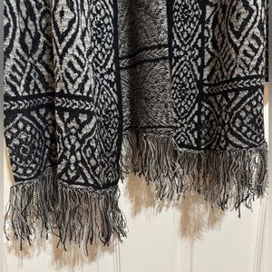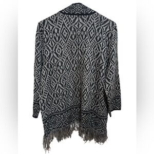 Lightweight but soft and cozy cardigan that is dark grey and black with fringe on the bottom. Size petite medium. Has 3/4 sleeves. Super cozy for in between weather. Great condition.