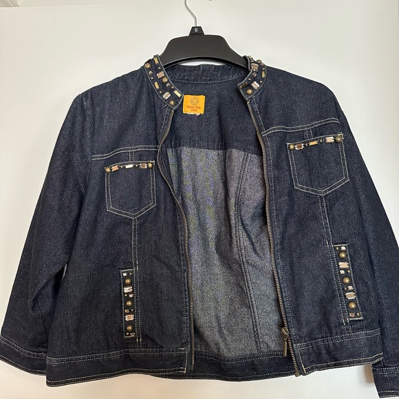 Rudy Rd. dark jean jacket with gold beading on the collar and pockets