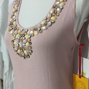 Sleeveless, round neck with large piece beading at the neckline; in a soft dusty pink ribbed knit fabric