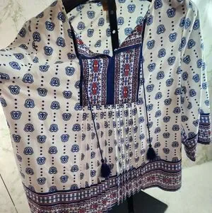NWOT!! Size large. 24 inches pit to pit, 28 inches long. 100% polyester, optional tie at neckline.