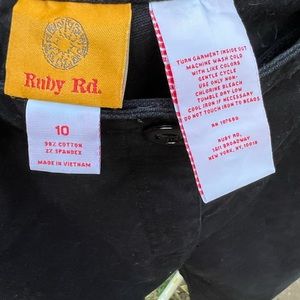 Ruby Rd Black Capris; machine wash and tumble dry; Excellent preowned condition; 98% cotton and 2% spandex; Size 10. These pants originally had decorative gold trim on bottom, but I removed it to make them more versatile.