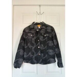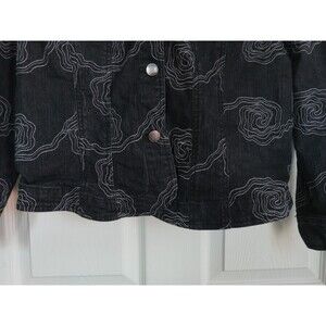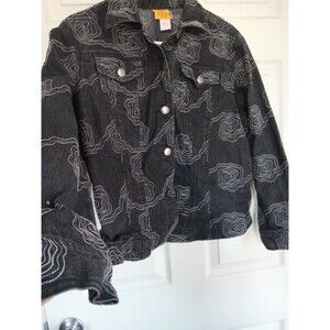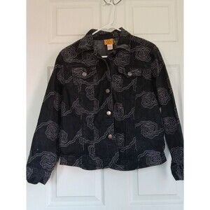 This is a Ruby Rd Black Denim Jacket Rounded Edge Embroidered Abstract Design Size 16P EUC.