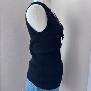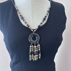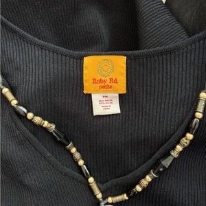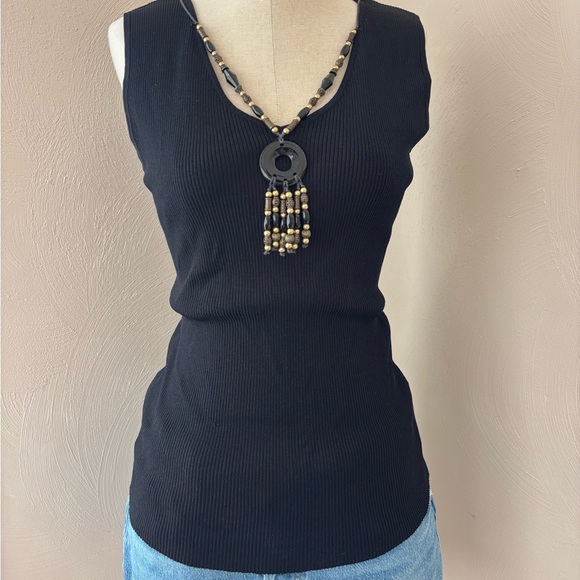 vintage ruby rd. black ribbed knit tank top with organic beaded necklace built in. in like new condition