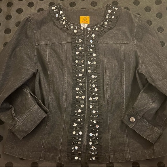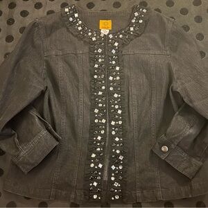 Very stunning statement piece! Ruby Rd - Denim Style Jacket - Size 16 - does have a little bit of stretch! Edging has lots of black and rhinestone sparkles! Excellent preloved condition - one tiny callout is a missing eye hook but honestly this jacket looks great worn open!! Great piece for a night out, bachelorette, birthday party, or any other special occasion!