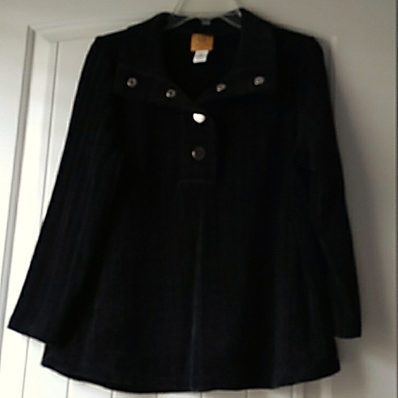 Plush velour black sweater by Ruby Rd with buttons that can be left open to show off a gorgeous necklace. Or button up if the weather starts to get cool. Petite large with 3/4 sleeves. Worn twice and stilling amazing condition.