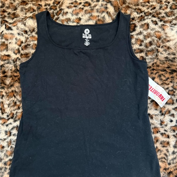 Simple black tank with a scoop neckline. Smooth, lightweight knit fabric. Classic sleeveless silhouette for layering or solo wear.