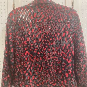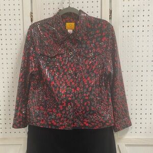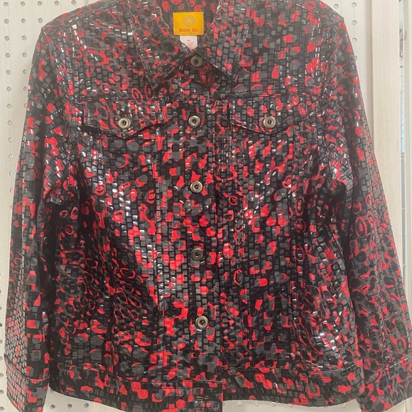 Stylish jean jacket with bold black and red pattern. Features button closure and classic design. Perfect for adding flair to any outfit.