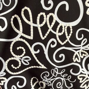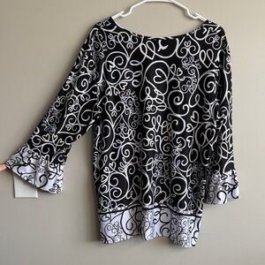 Chic black and white blouse with swirl patterns. Features long sleeves and a flattering fit. Ideal for versatile styling.