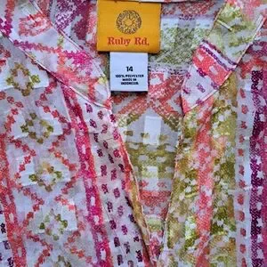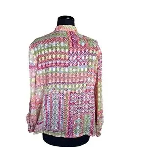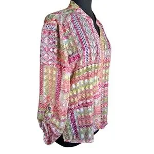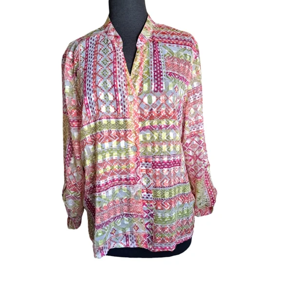 Ruby Rd Women's Multicolored Geometric Sheer Fabric Roll Tab Longsleeve V Neck Button Down Shirt Blouse Size 14.