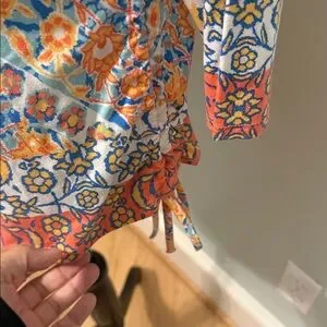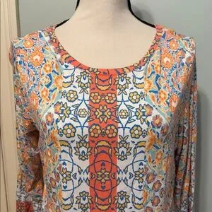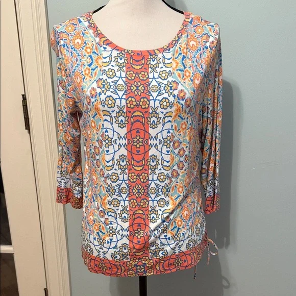 Blue and Peach Color Blouse. With Side Ruching. Mid Sleeves. By Ruby Rd. Size Large Petite.