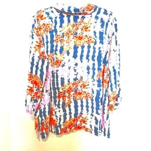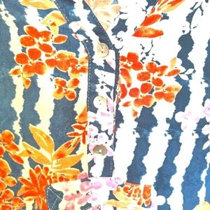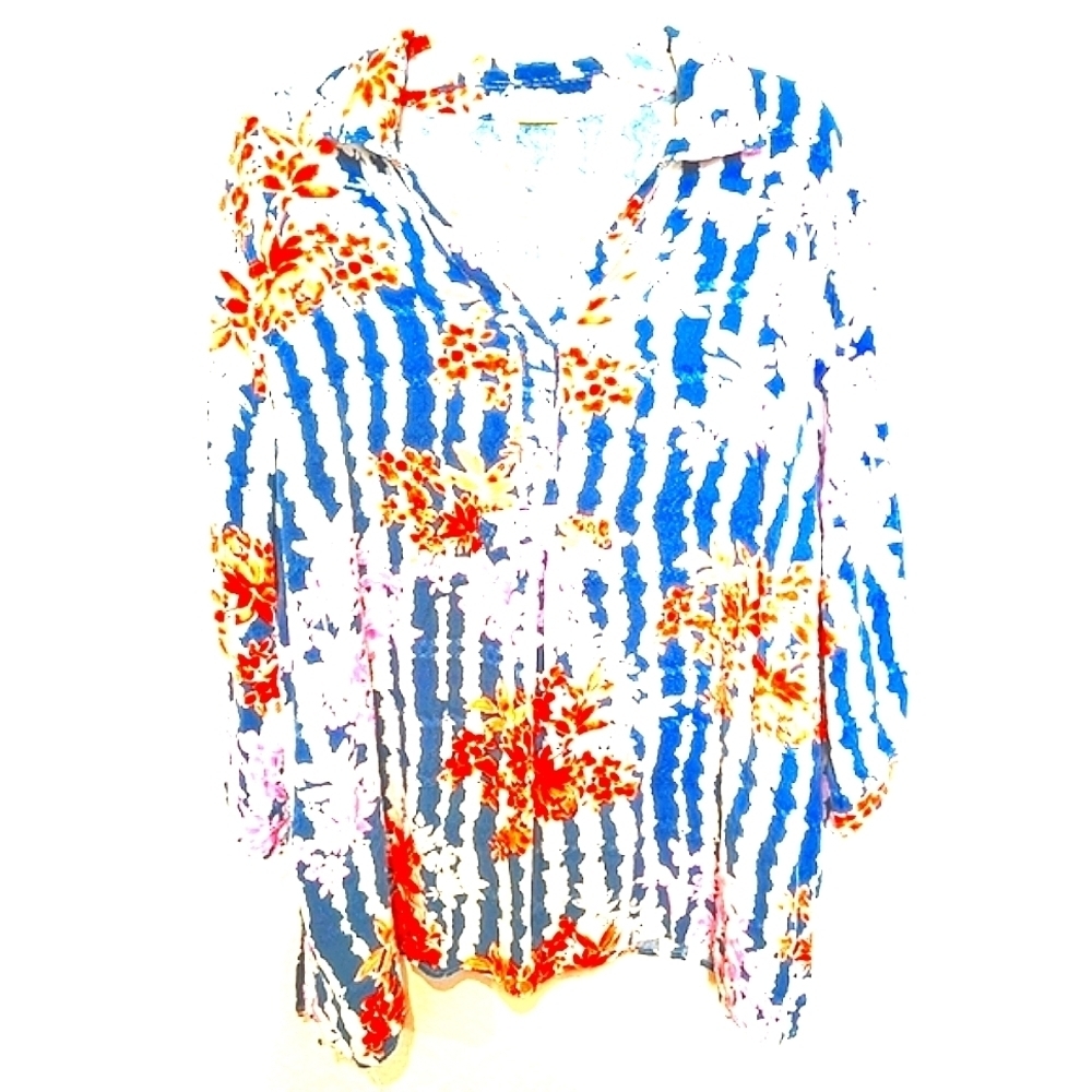 Stylish blouse with vibrant floral and striped pattern. Features orange, pink, and blue colors. 24 inches from pit to pit and 25 inches long from shoulder to bottom hem, slightly longer in the back. Very soft lightweight material with beautiful pearl buttons...it's also in great condition but main tag has been removed.