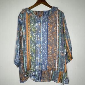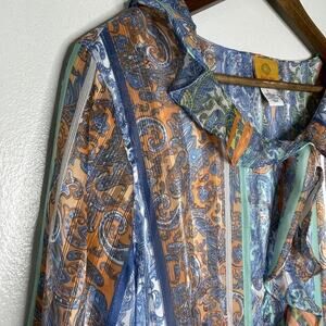 Ruby Rd Blouse Womens Large Blue Orange Paisley Ruffle Sheer Metallic Boho Top