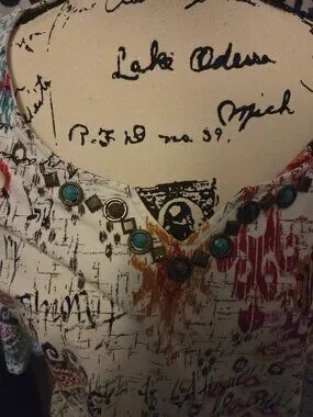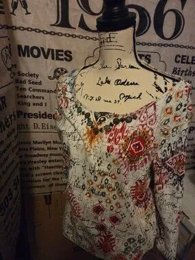 very pretty blouse 3/4 sleeves red and other multi colors. like new has turquoise stones around the top. size XL