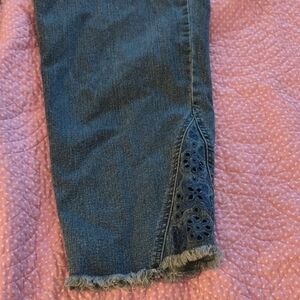 Pull on denim jeans by Ruby Rd. Wide waistband, no front pockets for clean lines. Lace detail and frayed edges on legs. Ankle length - 25 inch inseam. Size 14. Good used condition . Smoke free dog friendly home.