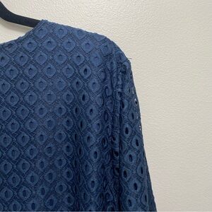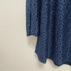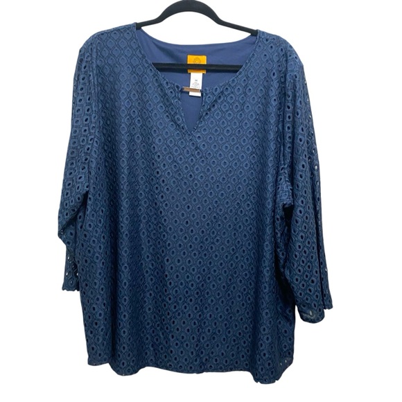 Stylish blue overlay eyelet blouse with a relaxed fit. 3/4 sleeves. Perfect for casual outings. Preowned condition. Size 3X