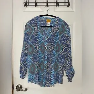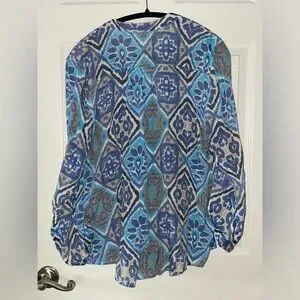 Lightweight button-front blouse with a geometric print. Breathable fabric with a relaxed silhouette. Long sleeves with button cuffs. Versatile for casual or dressy pairings.