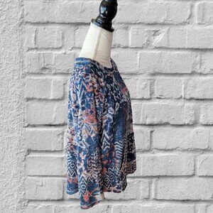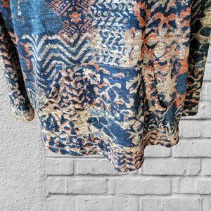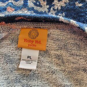Love this top! It is blue with abstract colors of peach and white intermixed. It is long sleeve and the front has a pocket that resembles the type on a sweatshirt. Very soft, by Ruby Rd. in a size Petite Large. Would look great with white slacks.