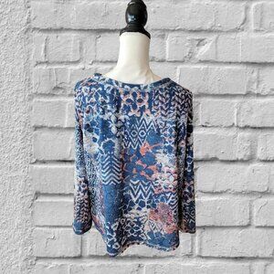 Ruby Rd. Blue Long Sleeve Top with Multi Colors Scoop Neckline in Size LP