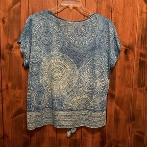 Chic blue blouse with intricate patterns. Features a tie-front design. Ideal for casual wear. Please refer to all photos and feel free to ask any questions you may have. Happy shopping!🛍😍