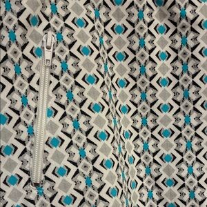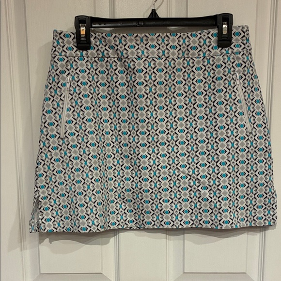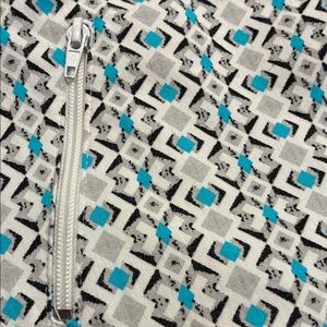 Chic mini skirt with a geometric pattern. Features white background with blue and gray tones. Perfect for versatile styling. Front side pockets with zipper and rear pockets.