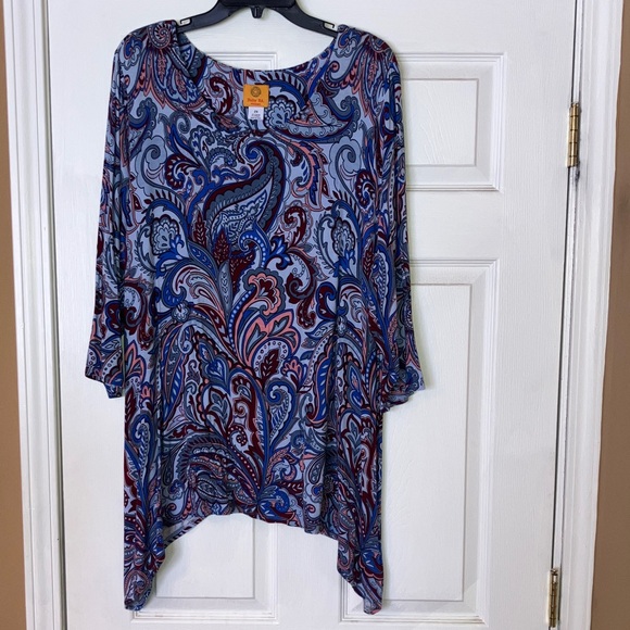 Elegant tunic with a bold paisley design. Features rich blue and red hues. Ideal for a chic, standout style.