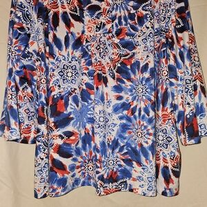 Vibrant red, white and blue printed blouse/top. Lightweight comfortable material. Great material for travel, doesn't wrinkle easily. Size 2x (18/20) **like new condition