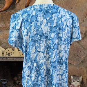 Chic blue and white blouse with intricate neckline. Perfect for casual outings.
