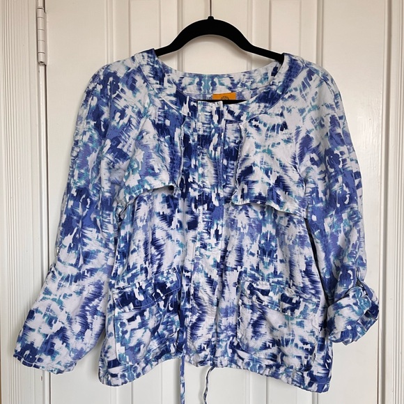 Chic linen blend cover with a dynamic blue and white design, snap front, pockets, roll/cuff sleeve, bottom drawstring, low profile collar. Ideal for versatile styling.