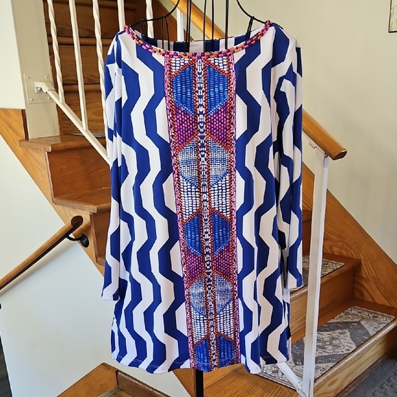 ❤️EUC❤️Ruby Rd. tunic featuring bold blue and white geometric print. Soft knit fabric with patterned hem. Versatile piece for layered outfits.
