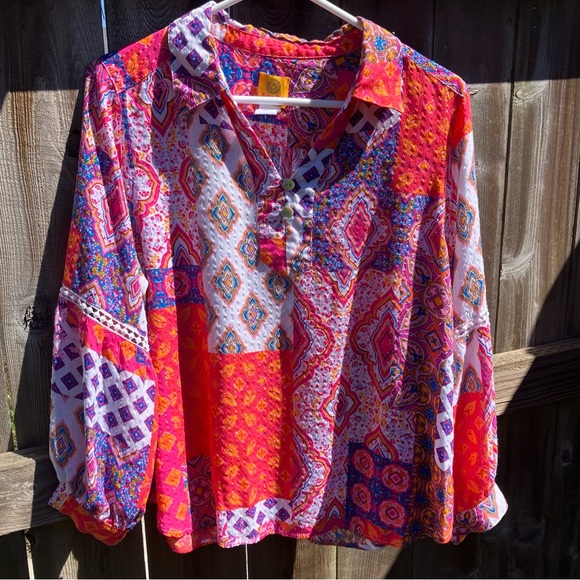 Add flair with this Ruby Rd. blouse. Features a lively patchwork of red, purple, and pink. Perfect for a bold look. Runs a little small. Brand new, washed, but never worn.