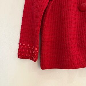 Elegant red cardigan with button closure. Features intricate knit detailing. Perfect for layering. Missing a couple rhinestones near one shoulder.