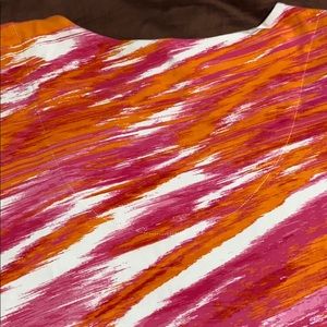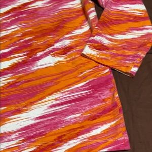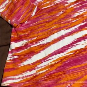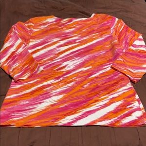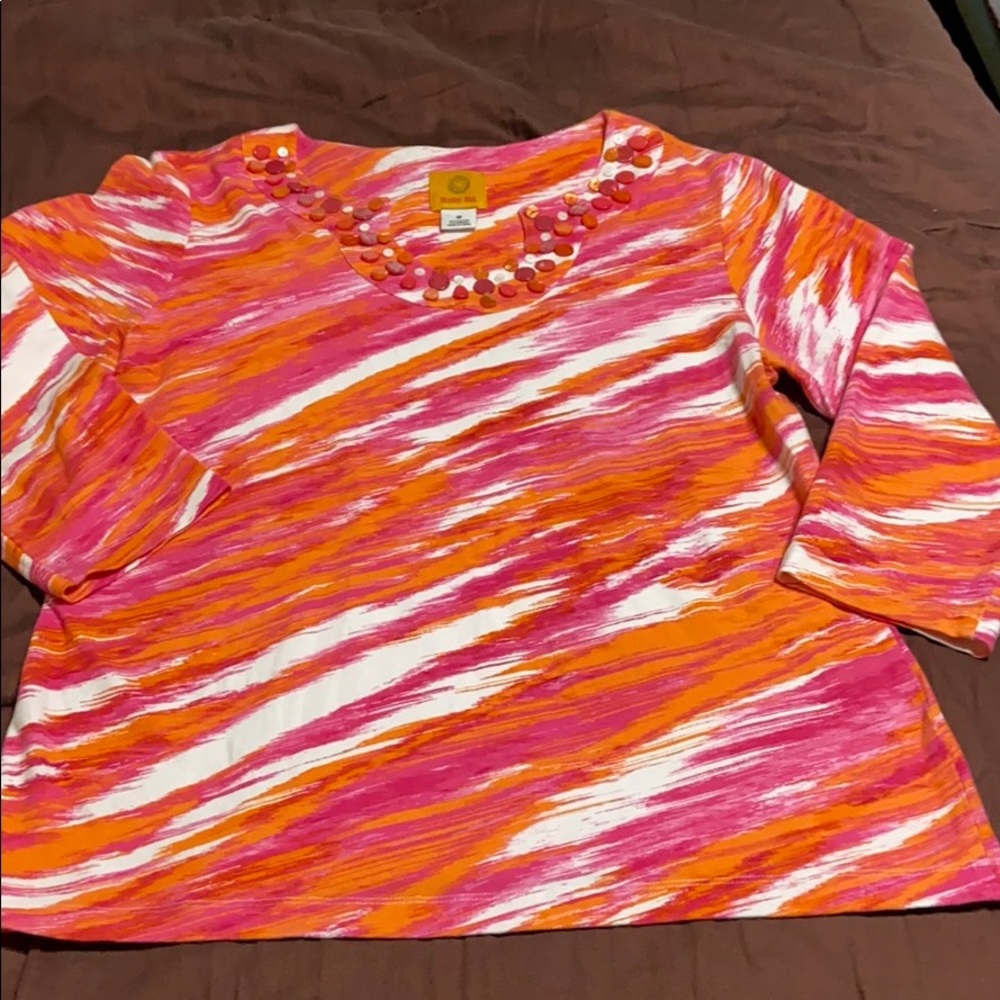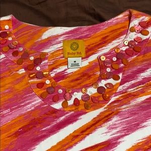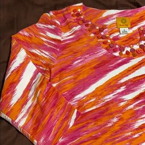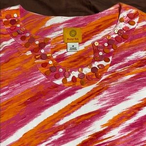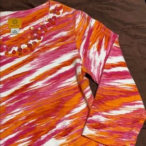 Women’s Pullover 3/4 Length Sleeves Top by Ruby Rd. Brand, Size Medium. Vibrant Pink, White & Orange Print, Decorative Neckline Embellished with Pink, White and Orange Gems. 95% Cotton/5% Spandex & Machine Washable. New Condition!