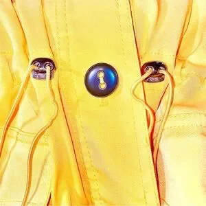 Vibrant yellow utility jacket with a cinch drawstring waist. Button-front closure with large contrast buttons. Adjustable Three-quarter sleeves with tab details. Front flap pockets for function. Stand collar with adjustable ties for added style. Collar Can be worn up for wind breaker or down for casual wear.