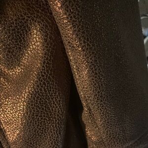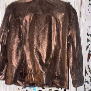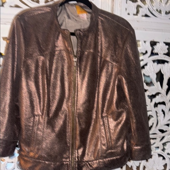 This brown l jacket from Ruby Rd. showcases a classic design with a luxurious metallic finish. Its relaxed fit and supple material make it a versatile choice for any occasion. The jacket features a simple collar and a full front zipper closure, adding to its timeless appeal.
