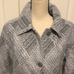 NWT Cozy brushed flannel jacket. Long sleeves with button cuffs. Button up front. 2 button closure front pockets. Collared. Perfect for the cooler weather. Size L Color Alabaster Gray pattern 23” PTP & 25.5” L Polyester