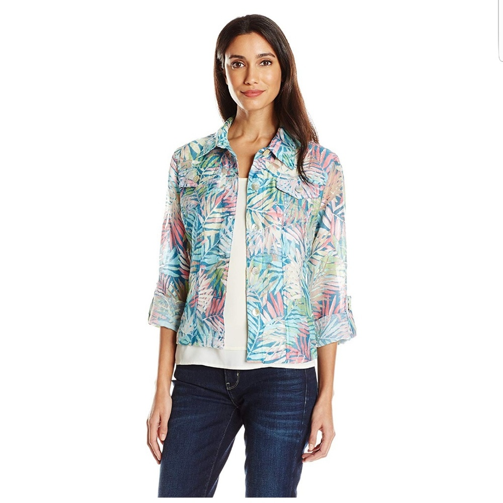 A traditional shirt jacket in all over printed burnout with tropical palms, perfect for warmer months.