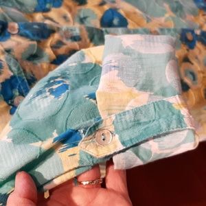 Beutiful for spring! Multi colors, teal, cream,blue,white,pale yellow. 100% Cotton. No stains or rips. comes from a smoke free & pet free home.