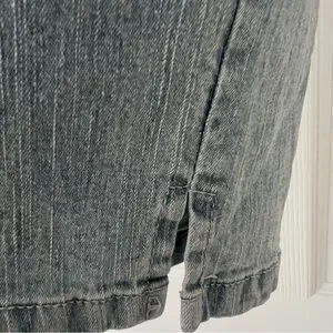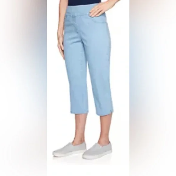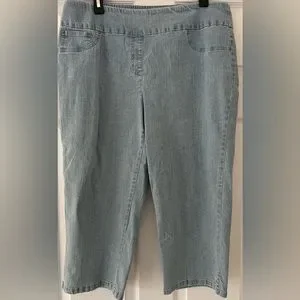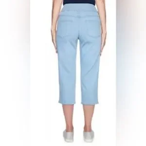 Stretch capri pull-on light wash denim jeans with faux front pockets for less bulk. Back pockets are functional. Side slit hem for comfortable fit. Waist measures 35”, rise is 11”, inseam is 20”. Great fabric, great fit, great looking jeans!