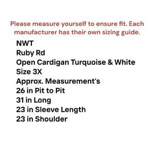 Ruby Rd Cardigan Women's SZ 3X Open Turquoise &White Fringe Hem Long Sleeve