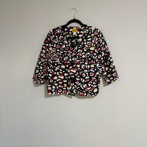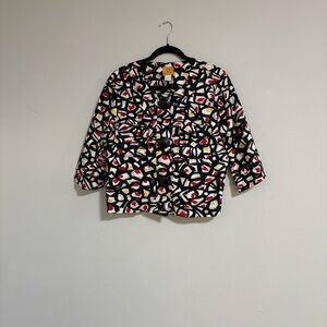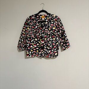 Stylish jacket with abstract design. Features black, red, and yellow accents. Perfect for bold fashion statements.