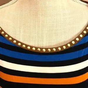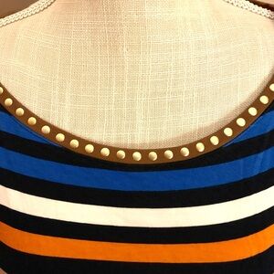 Bold stripes in blue, red, brown, and orange. Perfect for casual wear. Comfortable and chic. Features three-quarter length sleeves and a scrunch tie on one side. Never worn, no tags.