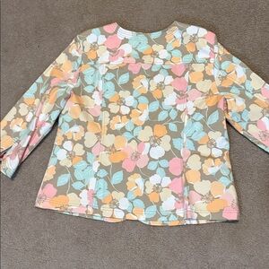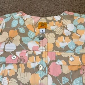 Elegant jacket with a coral and cream floral design. Front pockets with button down design. Perfect for any occasion.