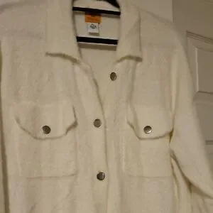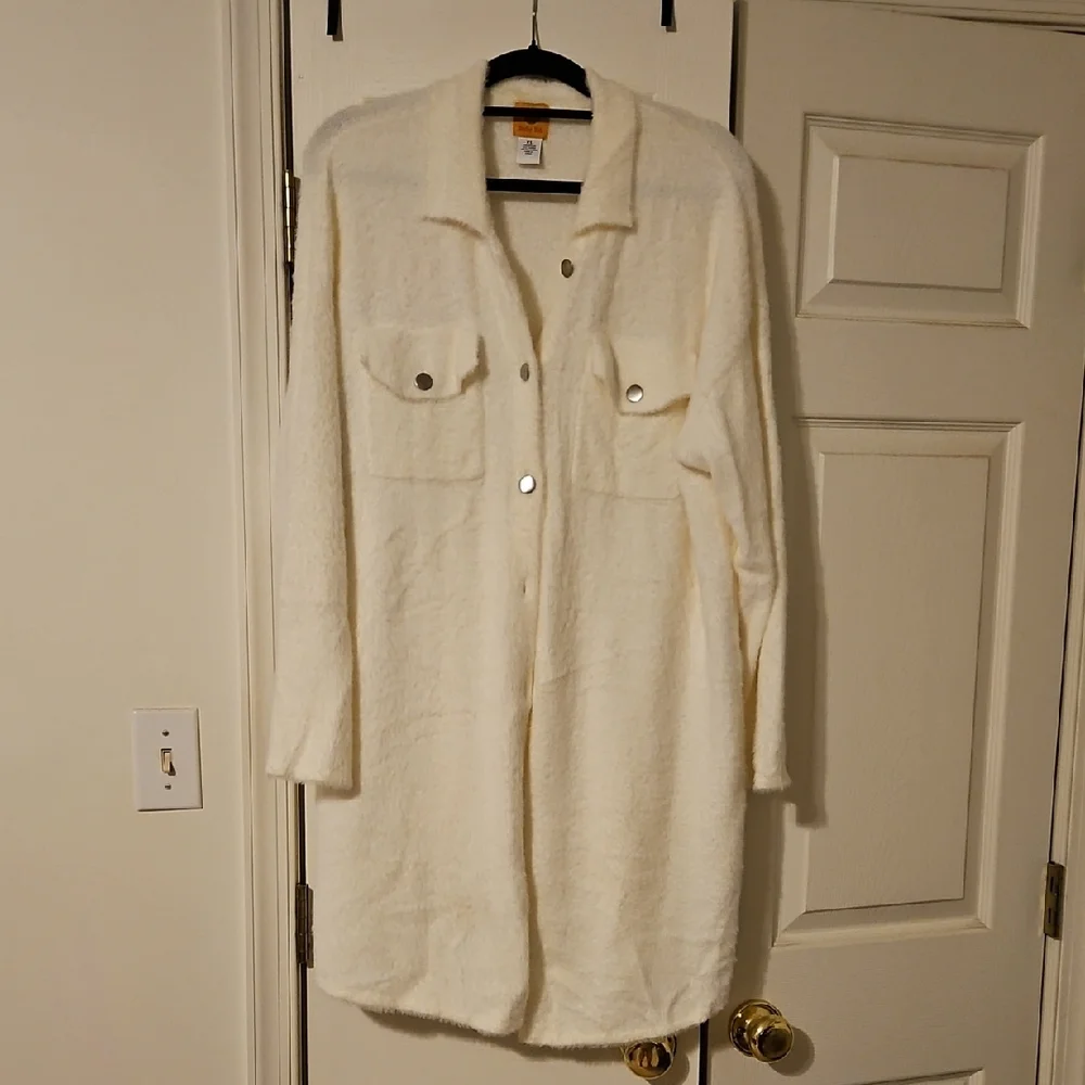 Elegant cream sweater/coat with button-up design. Features chest pockets. Silver metal buttons on front and pockets. Extremely soft!