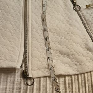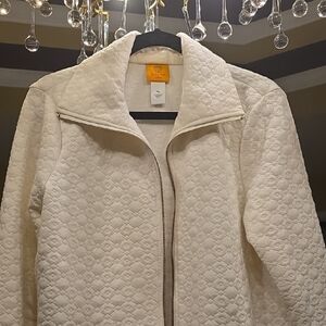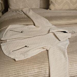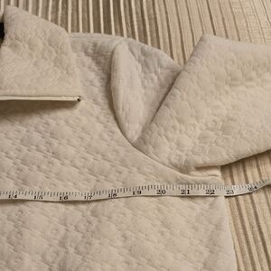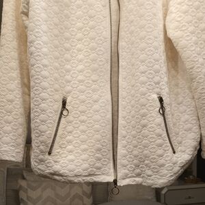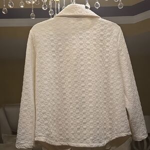 Cozy teddy jacket with quilted texture. Features sleek zip pockets. Perfect for layering.