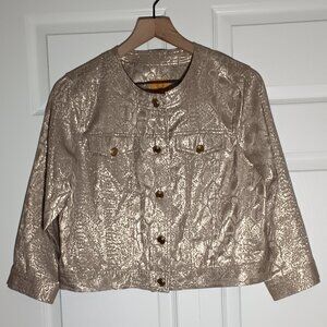 Ruby Rd Cropped Jacket Size 8 Long Sleeve Button Up Shiny Gold Snakeskin Print